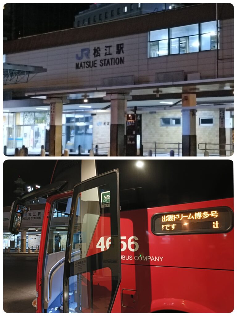 松江駅から、「出雲ドリーム博多号」🚍22時35分発。